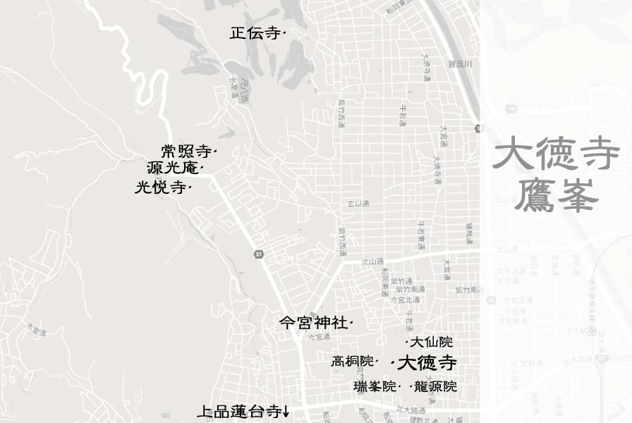 大徳寺・高峯は京都の北野や西陣の北に位置し、上賀茂・下鴨の西に位置する場所。大徳寺は、豊臣秀吉・千利休とゆかりのある大きな寺で、いくつもの塔頭がある。大徳寺の周りは、大徳寺の門前町になっている。大徳寺の北西には、山麓の高峯地区がある。高峯は光悦が移り住んで作った芸術の郷。江戸時代の文化の情緒がある。